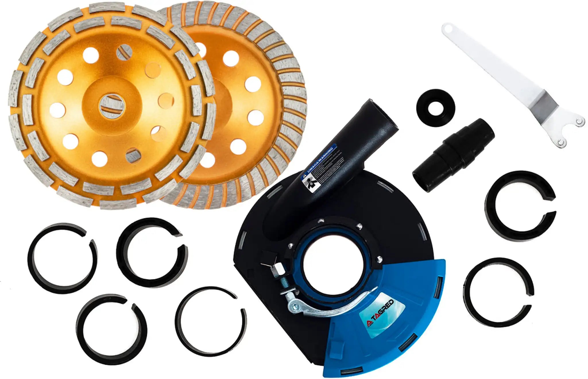 Extractor hood angle grinder set + 2x diamond grinding cup 180 mm segment & turbo – professional solution for concrete, screed and stone