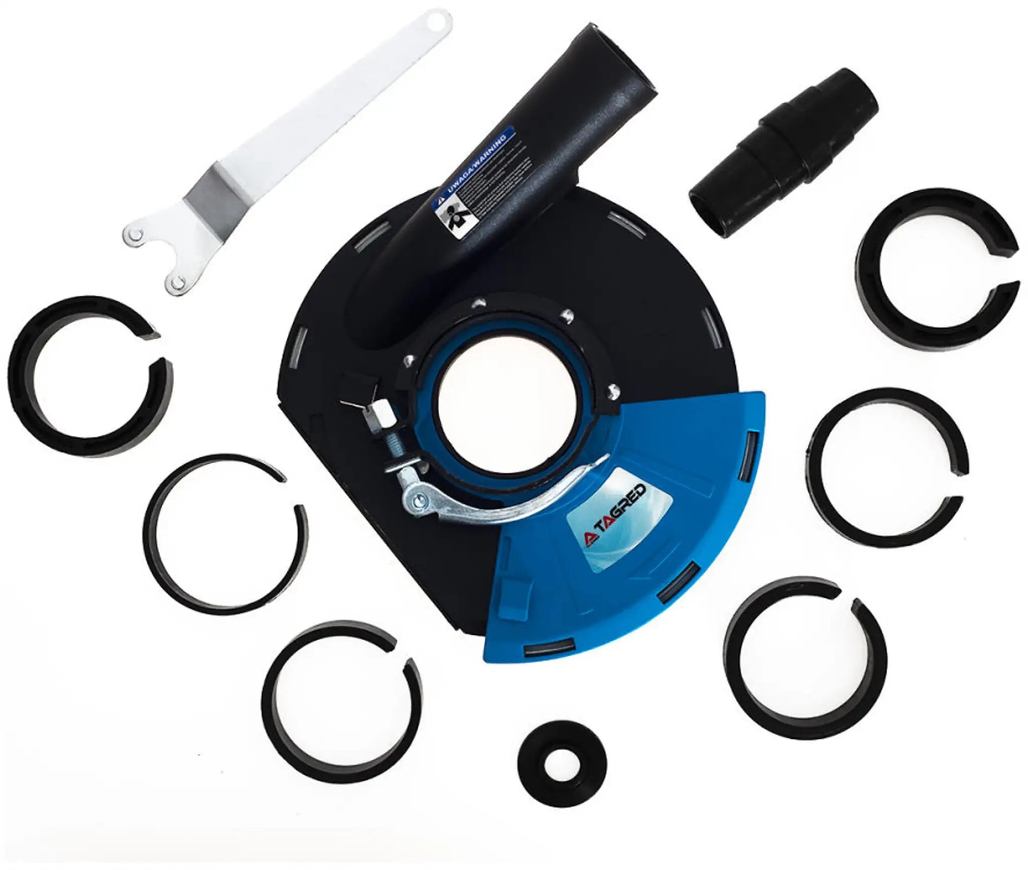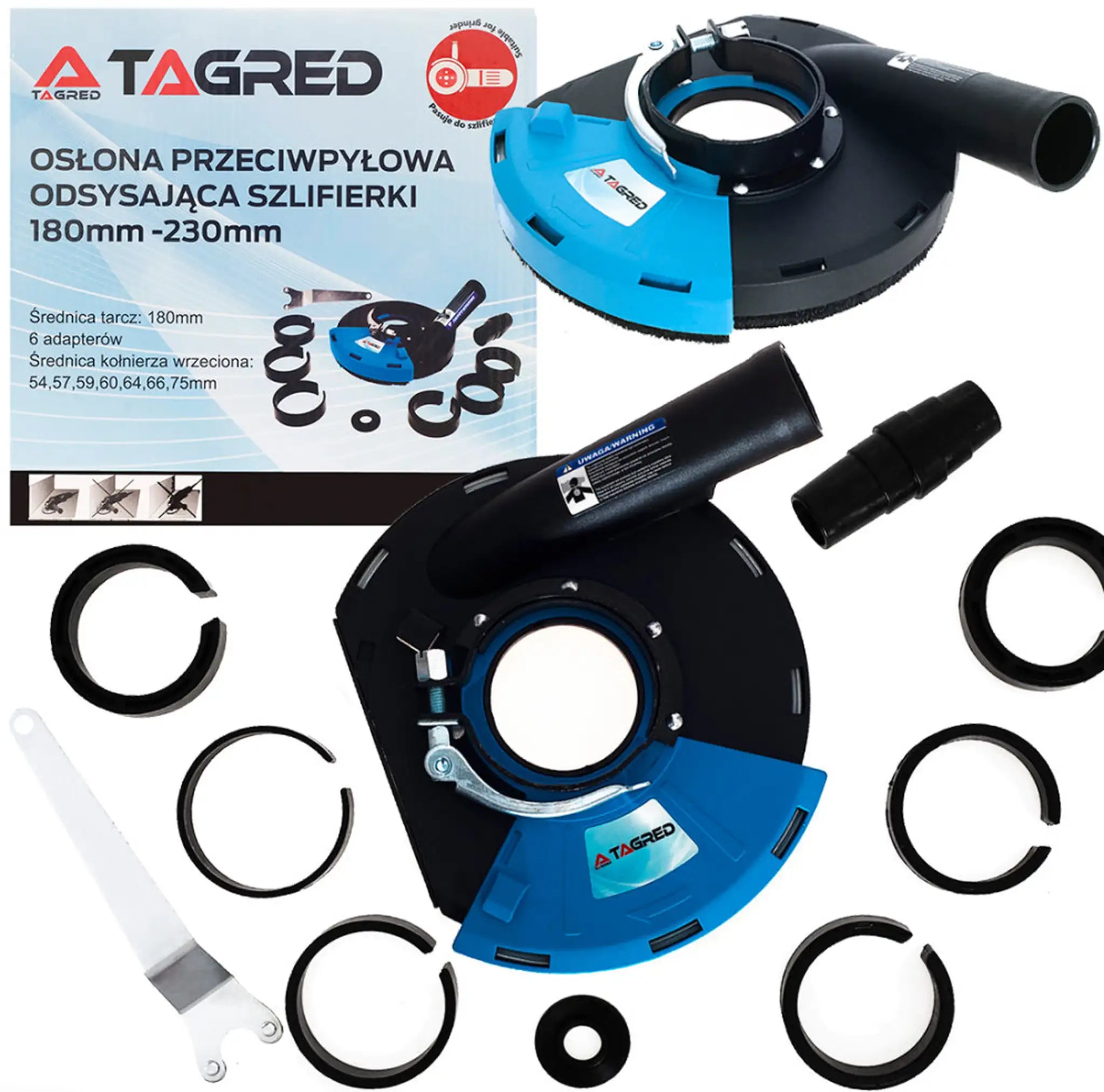 Suitable for angle grinders of sizes 180 mm and 230 mm. Additional flanges and a rubber connector ensure a secure hold. -